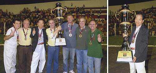 상파울루주 프로축구 리그 결승에서 우승 후 김흥태 구단주(왼쪽에서 세번째)와 구단 스태프들이 우승 트로피를 들고 기념촬영하고 있다. 소로카바 클럽 제공