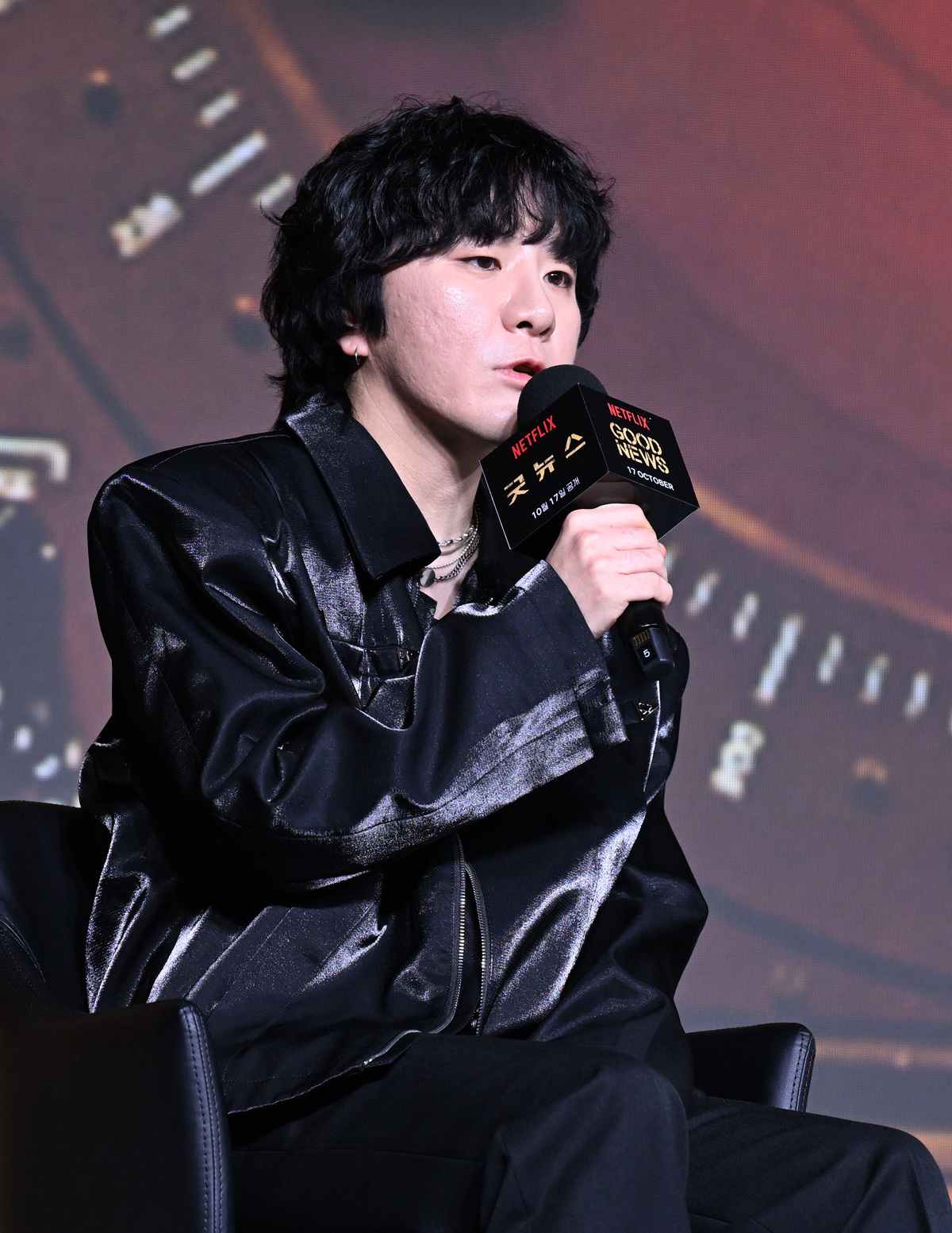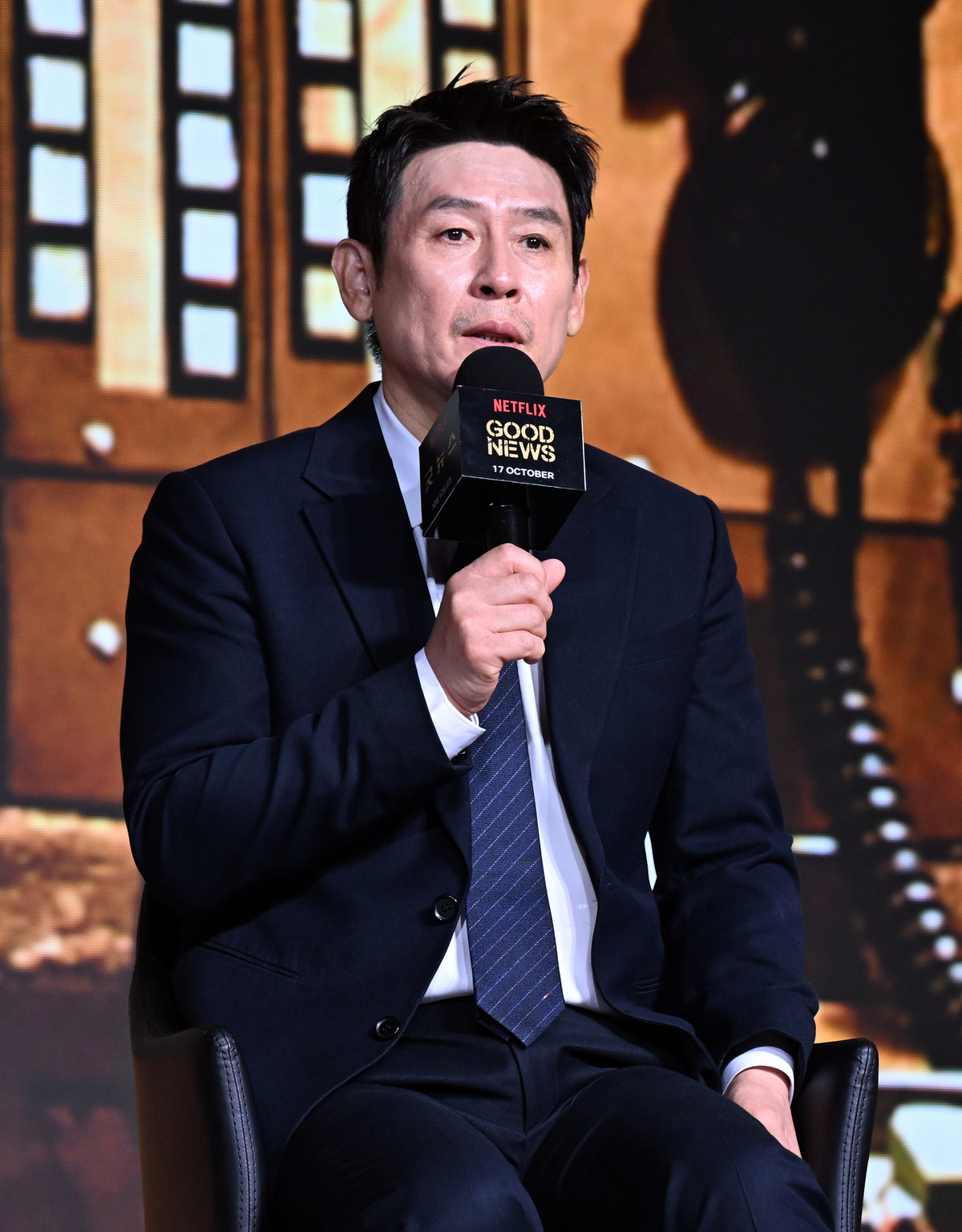 14일 서울 동대문 JW 메리어트에서는 넷플릭스 영화 굿뉴스 제작보고회가 열렸다. 현장에는 변성현 감독과 배우 설경구, 홍경, 류승범이 참석했다.