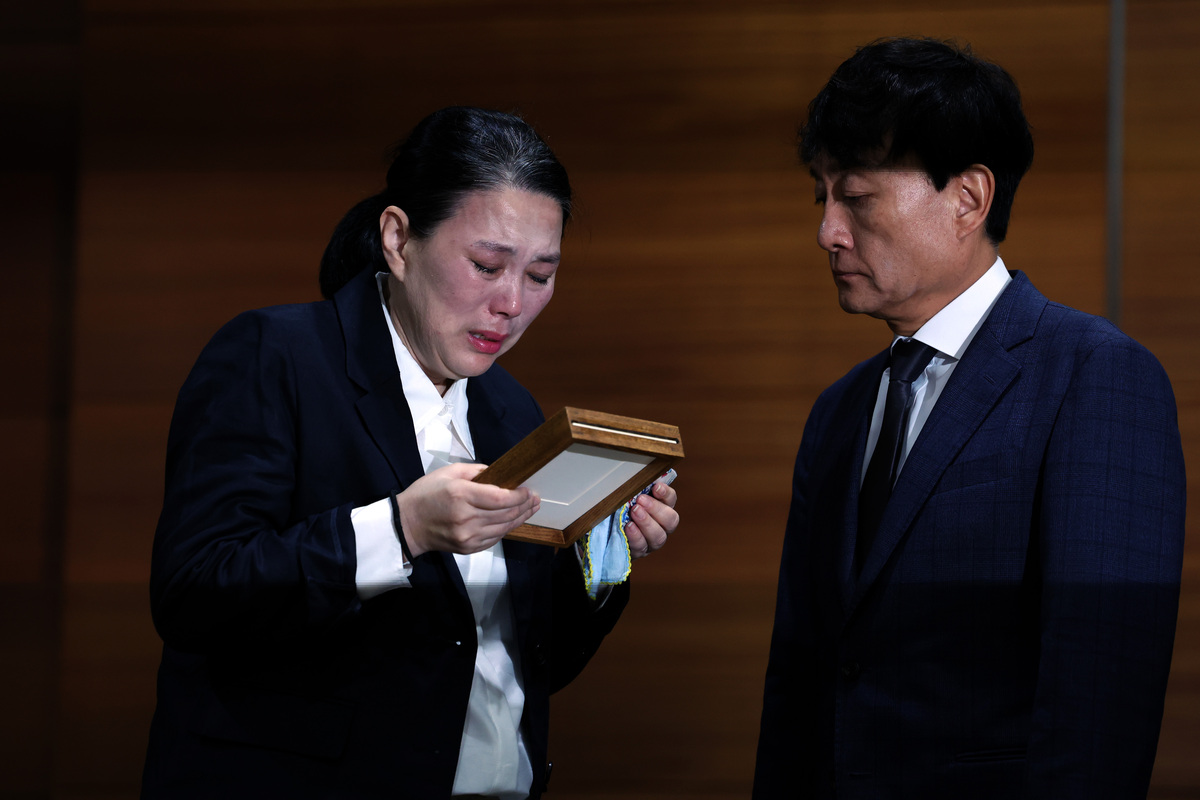 고 오요안나씨 어머니 장연미씨가 15일 오전 서울 마포구 MBC에서 열린 고 오요안나 1주기 관련 대국민 기자회견에서 안형준(오른쪽) MBC 사장에게 명예사원증을 전달 받은 후 슬퍼하고 있다. 뉴시스 제공