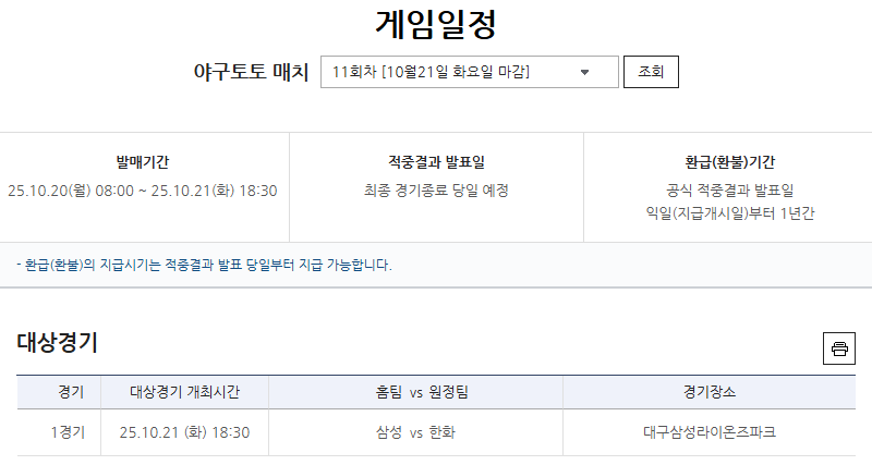 한편, 2025 KBO PS PO 3차전 삼성(홈)-한화(원정)전 경기를 대상으로 하는 프로토 승부식 124회차의 자세한 경기 분석 내용 등은 베트맨 내 토토가이드 페이지에서 확인할 수 있다.