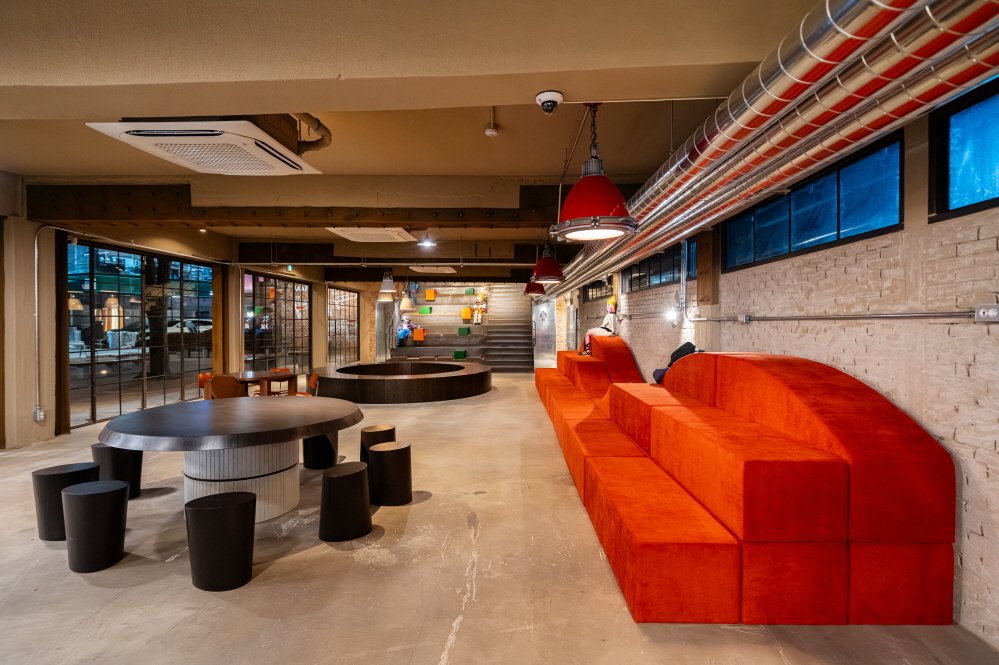 외부는 콘크리트·벽돌이 어우러진 클래식한 외벽, 내부에는 아디다스를 상징하는 삼선(3 STRIPES)을 곳곳에 반영해 브랜드의 정체성을 녹여냈다.