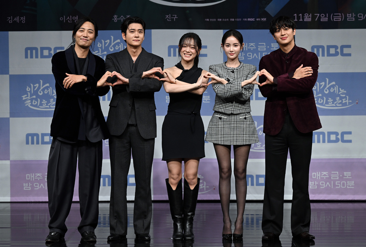 30일 서울 마포구 상암동 MBC 골든마우스홀에서 새 드라마 이강에는 달이 흐른다 제작발표회가 열렸다. 오는 11월7일 첫 방송 하는 14부작 이강에는 달이 흐른다는 웃음을 잃은 세자와 기억을 잃은 부보상의 영혼 체인지 로맨스 판타지 사극이다. 2019년 녹두전으로 인생작을 남긴 강태오와 사극에 처음 도전하는 김세정이 각각 대리청정 중인 왕세자 이강, 타고난 부보상 박달이 역을 맡아 호흡한다.