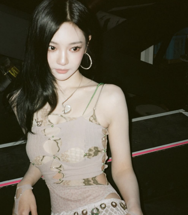 공개된 사진에서 닝닝은 피부 톤에 자연스럽게 맞춰진 시스루 바디수트를 입고 있다. 몸의 곡선을 살리는 패턴으로 미래적인 무드를 완성했고, 풍성하게 퍼지는 짧은 화이트 튈 스커트가 더해져 발레 의상을 연상시키는 실루엣을 만들었다. 같은 계열의 타이트한 소재가 다리를 감싸 부드러운 곡선을 만들었으며, 발목에 리본처럼 묶인 스트랩 힐이 드라마틱한 포인트가 됐다.