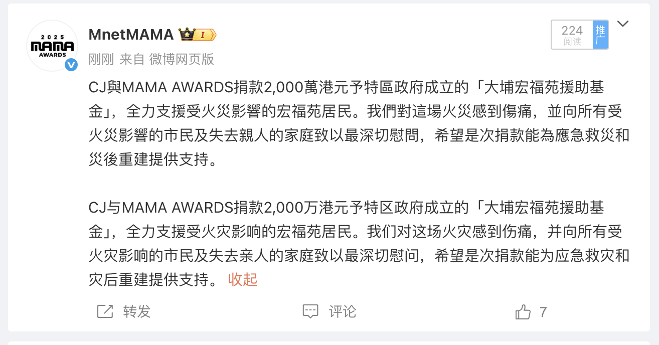 ‘마마 어워즈’ 주최 측은 28일 중국 SNS 웨이보 공식 계정에 글을 올려 “CJ그룹과 2025 MAMA AWARDS은 타이포 웡 푹 코트 지원 기금(Support Fund for Wang Fuk Court in Tai Po)에 2000만 홍콩 달러(약 38억원)를 기부하기로 결정했다. 화재로 피해를 입으신 모든 분들께 깊은 애도와 진심 어린 위로를 전한다”며 “이번 기부가 구조 활동과 후속 지원에 힘이 되길 바라며, 피해 지역이 하루빨리 안정과 평안을 되찾기를 기원한다”는 위로의 메시지를 더했다.